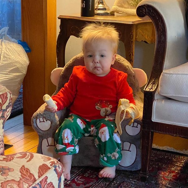 peruviandiol he's sitting in a monkey chair eating a banana.